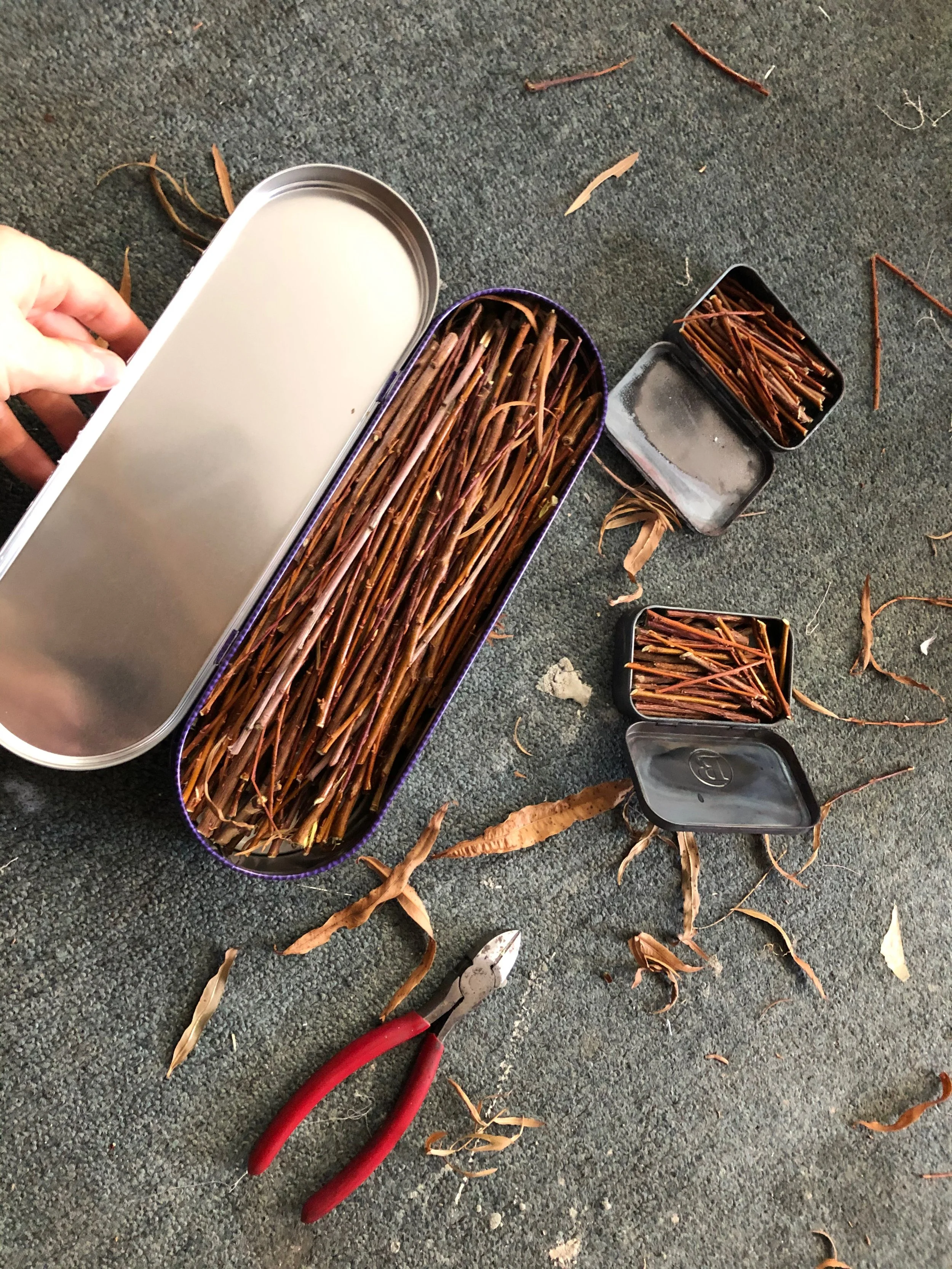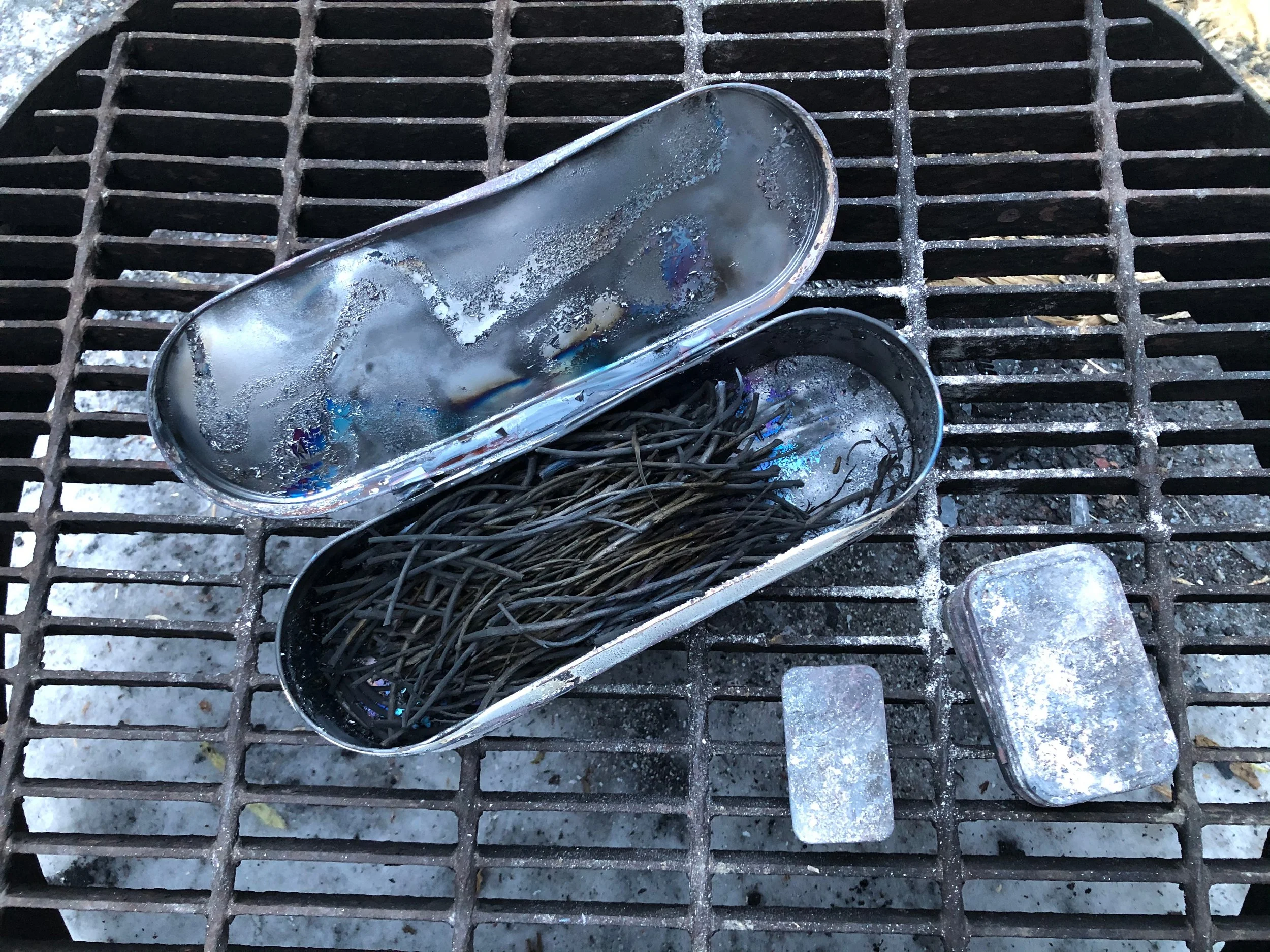 This ink was made from gathered willow branches that we put in empty Altoids mints tins and then placed in the embers of a campfire for several hours. This method carbonizes the wood (slowly removes the oxygen from the wood, only leaving the charcoal – which is carbon and minerals – behind). The carbonized wood was then pulverized to a fine powder in a coffee grinder and water and Gum Arabic were added to it.