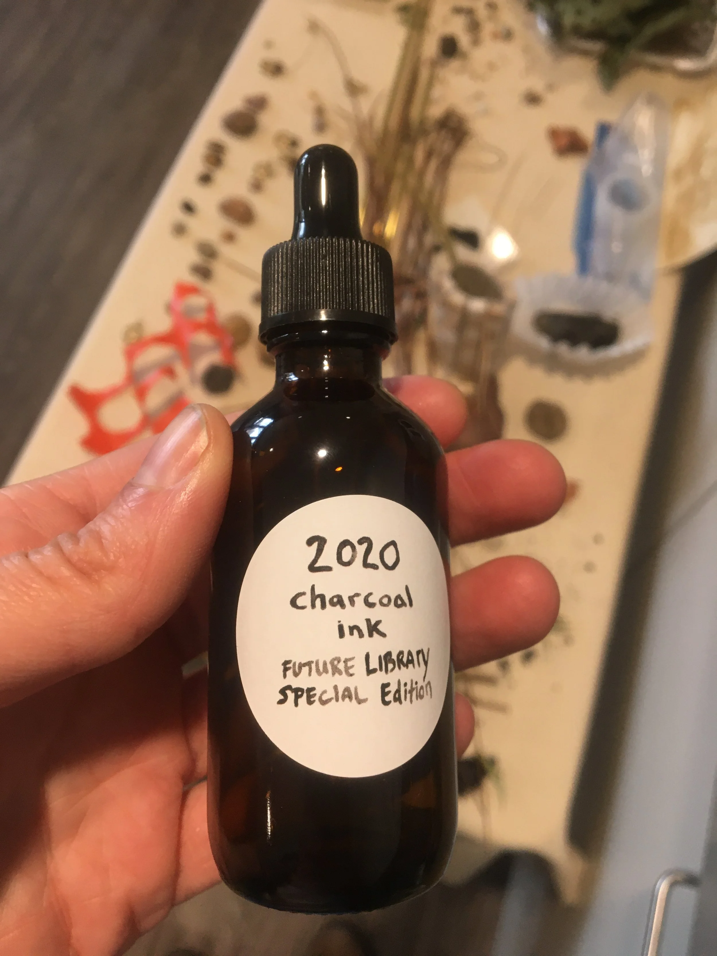 In 2020, we (Taryn Kneteman and Alma Louise Visscher) created several bottles of charcoal ink that we gave as gifts to makers and other folks in our community. This ink was made on the last evening of 2020 with the hope of creating something from the residual energy and material of the previous year. We made the ink at a recreational site managed by the City of Edmonton, situated in the North Saskatchewan River Valley in Amiskwaciwâskahikan (so-called Edmonton).