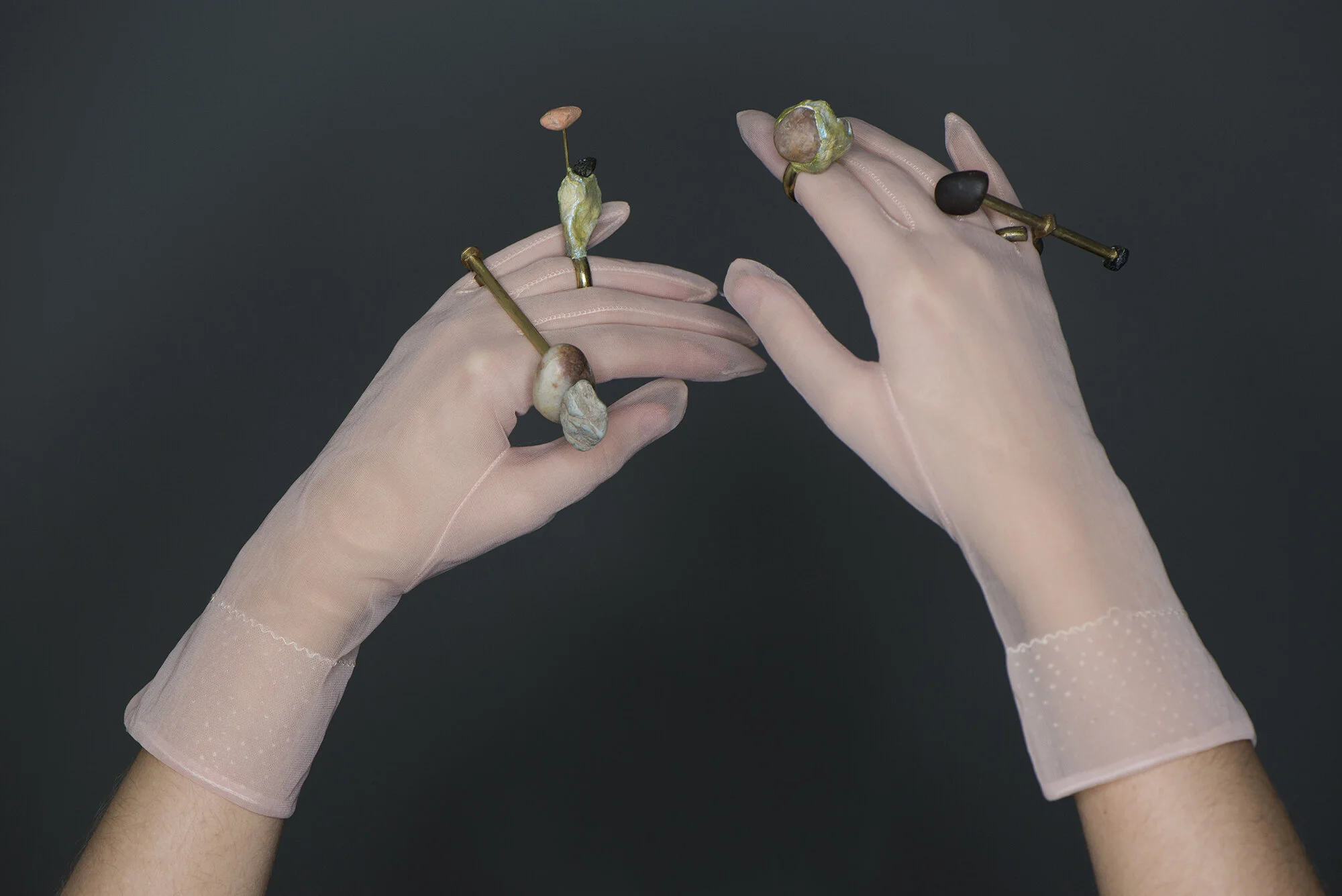Hand to carry, 2020. Taryn Kneteman and Alma Louise Visscher .Vintage brass curtain eyelets, vintage gloves, stones, clay, and fabric ink. Dimensions variable.